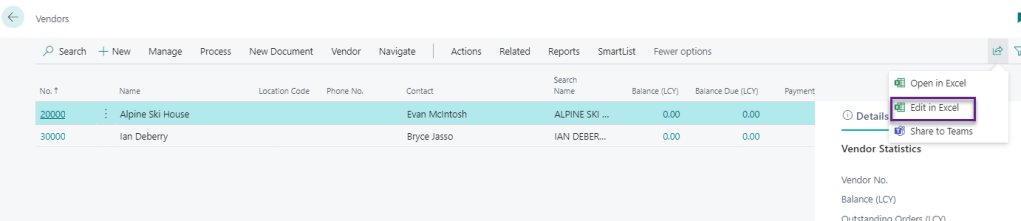 Open the vendor List and click on Edit in Excel as shown below.